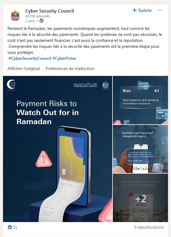 Le calendrier n’est pas neutre. L’annonce coïncide avec le début du Ramadan, période de hausse des dons et des transactions en ligne aux Émirats arabes unis et plus largement dans le monde musulman. Le Conseil appelle les résidents à redoubler de prudence, notamment lorsqu’il s’agit de dons, de partage d’informations personnelles, ou de mouvements financiers. C’est un rappel d’hygiène numérique, mais aussi une lecture de la menace, les attaquants aiment les pics saisonniers, car l’émotion et l’urgence accélèrent les clics, et réduisent la vérification.